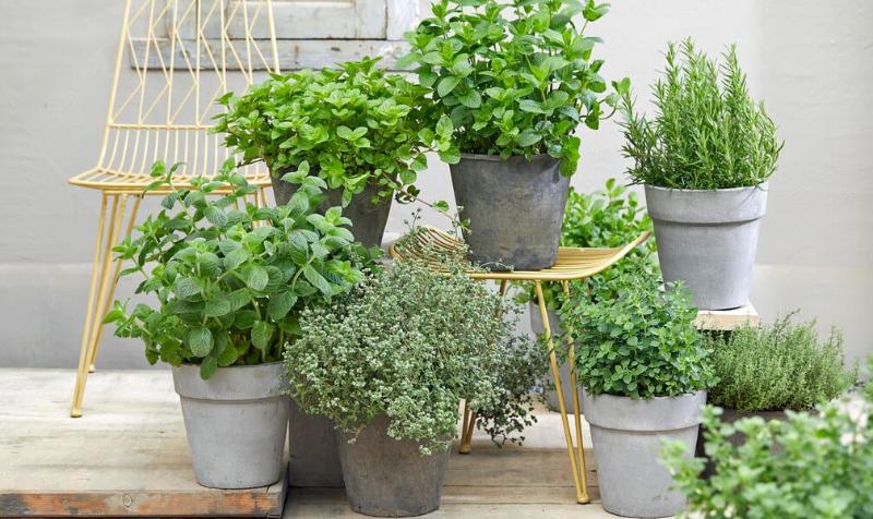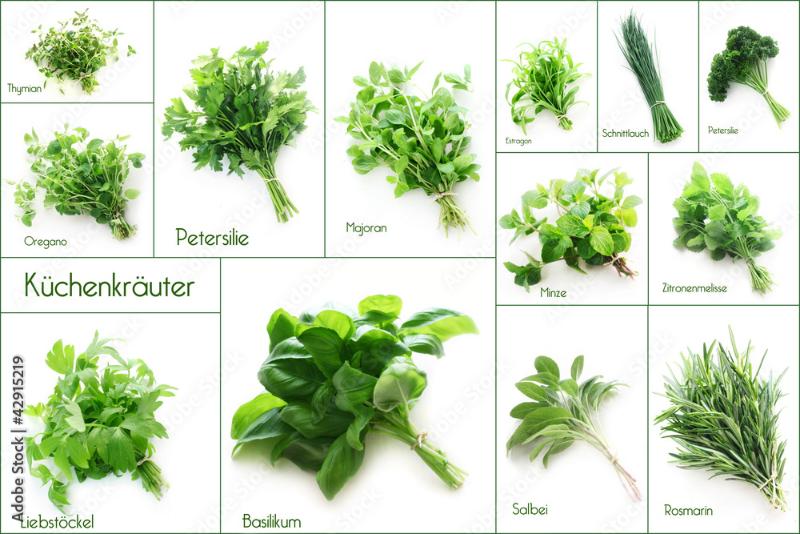 Oregano, Majoran, Thymian, Rosmarin, aufrechte Kresse, marokkanische Minze, Zitronenmelisse, Salbei, Zitronenverbene, Currykraut, Bergbohnenkraut, griechischer Bergtee, Waldmeister, Frauenmantel, Stevia, Schnittlauch.