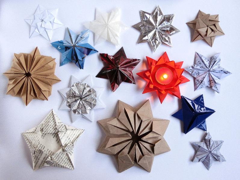Origami Sterne als Fensterdeko oder teilweise Teelichthalter (Achtung! Keinesfalls unbeaufsichtigt brennen lassen, da brennbares Papier)